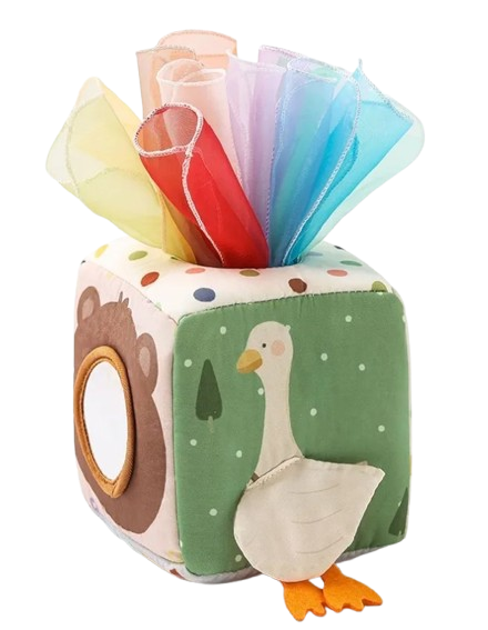 A baby tissue box toy is a fun and educational plaything designed to keep little ones entertained while boosting their development. Made with soft, baby-safe materials, it allows infants to pull out colorful cloth tissues that mimic the action of a real tissue box. This engaging activity helps improve fine motor skills, hand-eye coordination, and finger strength. The bright colors and playful patterns stimulate visual senses and encourage curiosity. Lightweight and easy to handle, it is perfect for babies to play with independently. The toy is safe, washable, and reusable, making it a practical choice for parents. Its interactive design promotes problem-solving and imaginative play. Suitable for home or travel, it keeps babies engaged and happy for hours. A baby tissue box toy is not just entertaining but also a valuable tool for early learning and development.