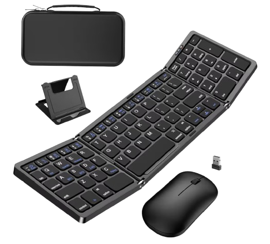 Foldable keyboard and mouse offer compact portability for on-the-go productivity.